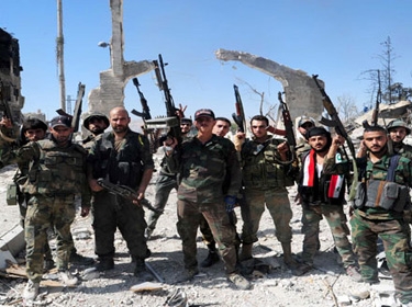 Syrian infantrymen and NDF pose in front of the destruction brought on Al-Dukhkhaaniyya by the disease-carrying rats of ‘Alloosh and the so-called Islamic Union.