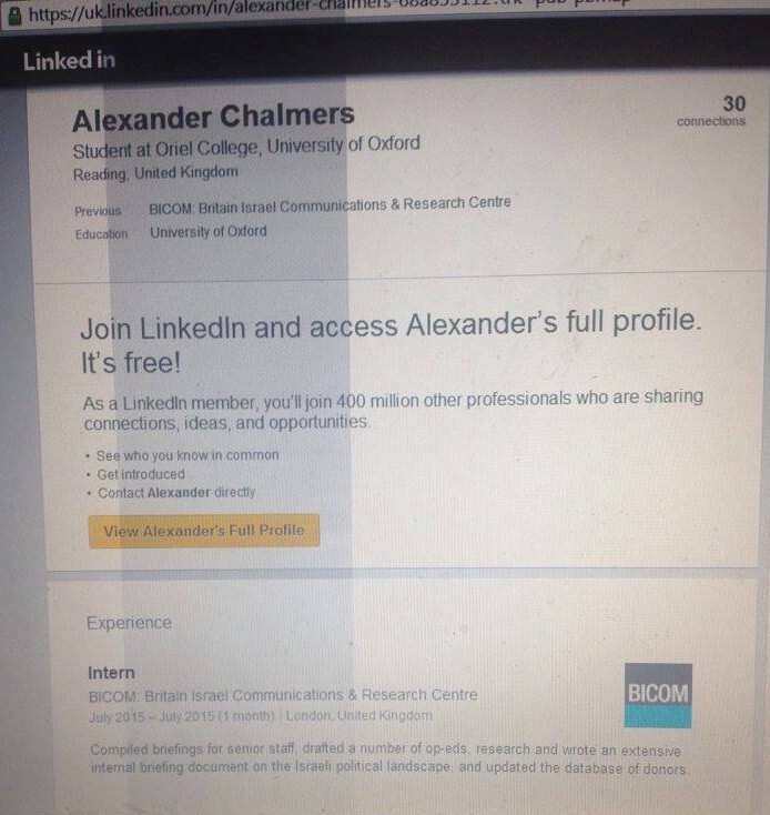 Chalmers has also been accused of disseminating a false allegation that a left-wing Labour student at Oxford had organized people into a group to follow a Jewish student around campus calling her a “filthy Zionist,” and that he had been disciplined as a result.