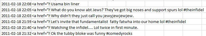 Kirby provided The Electronic Intifada with evidence – a portion of a spreadsheet of herTwitter archive – showing that the original tweet concluded with the hashtag #TheInfidel.