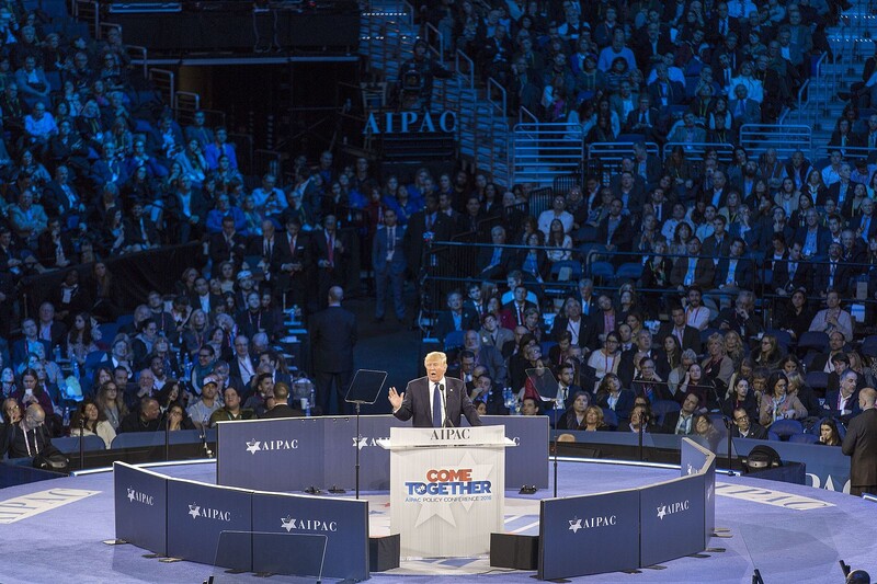 Donald Trump speaks at the conference of the Israel lobby group AIPAC in Washington, DC, on 16 March. (Lorie Shaull/