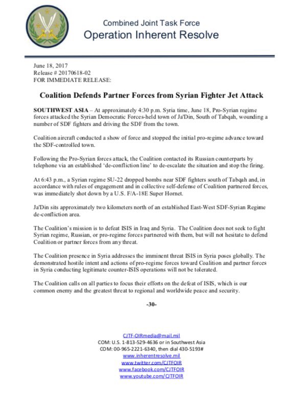 This would appear to be the latest attempt to partition Syria. The US-backed Syrian Democratic Forces, or SDF, seem well on their way to defeating ISIS in Raqqa. The Coaliton press release, pictured above, talks about a “show of force” aimed at stopping “the initial pro-regime advance” toward an SDF-controlled area, in this case the town of Ja’Din. This would tend to suggest that any future efforts by the Syrian Army to re-establish national sovereignty in this part of the country will be met with US airstrikes.